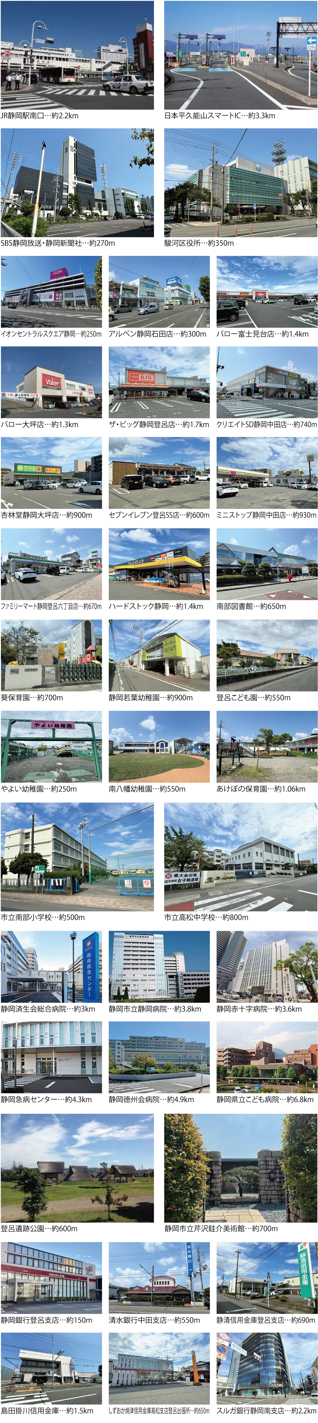 静岡駅南口から石田街道を南へ2.1㎞、石田交差点の東、イオンセントラルスクエア静岡南側の住宅街に都市型3階建て2区画の分譲地が誕生しました。周辺には静岡新聞社SBS静岡放送の本社や登呂遺跡公園がある閑静なエリアです。徒歩圏内にスーパー、コンビニ、ドラッグストアなど生活利便施設が充実し、保育園や幼稚園、小中学校、駿河区役所も近く子育てするのにも快適な立地となっています。