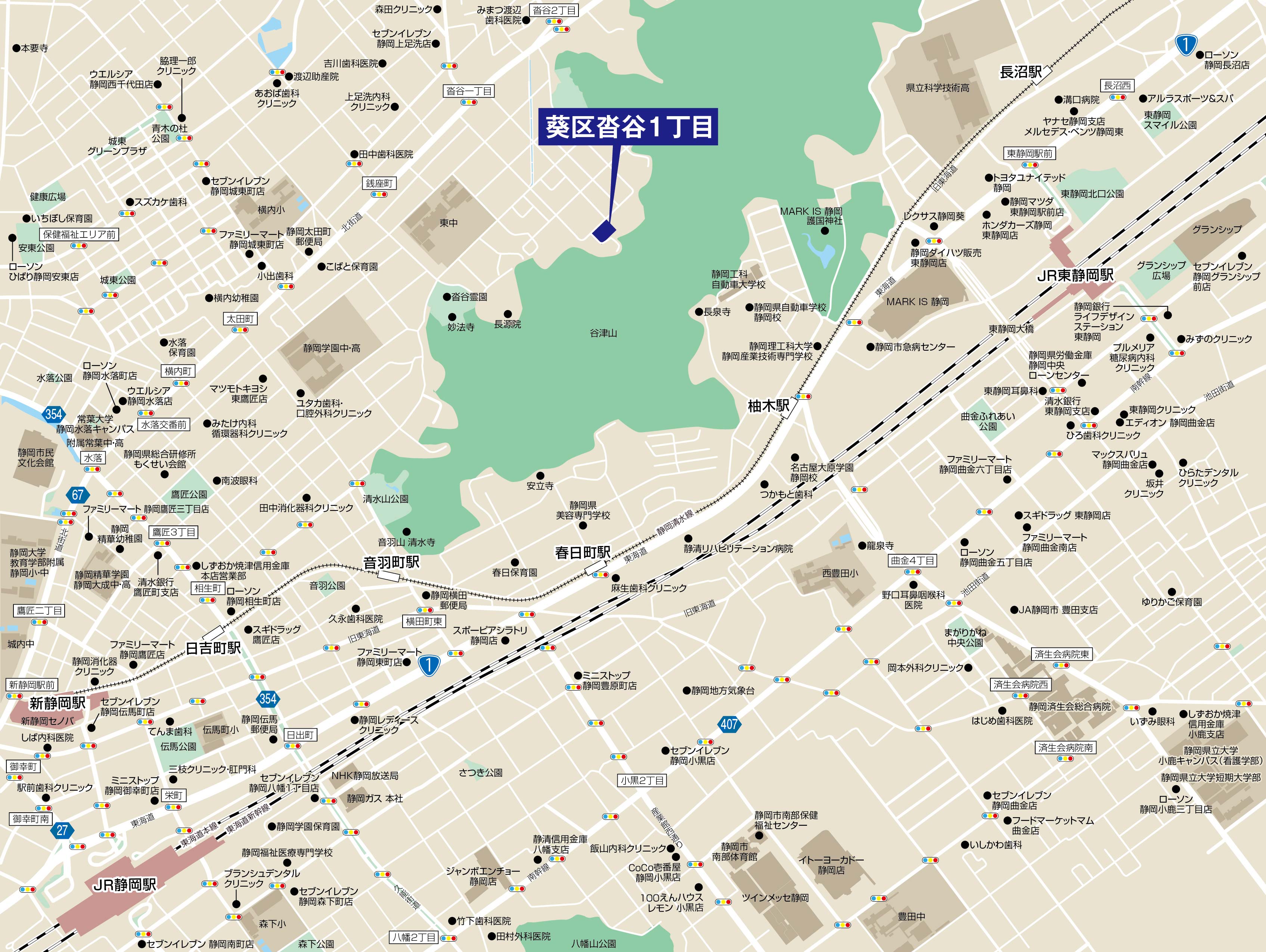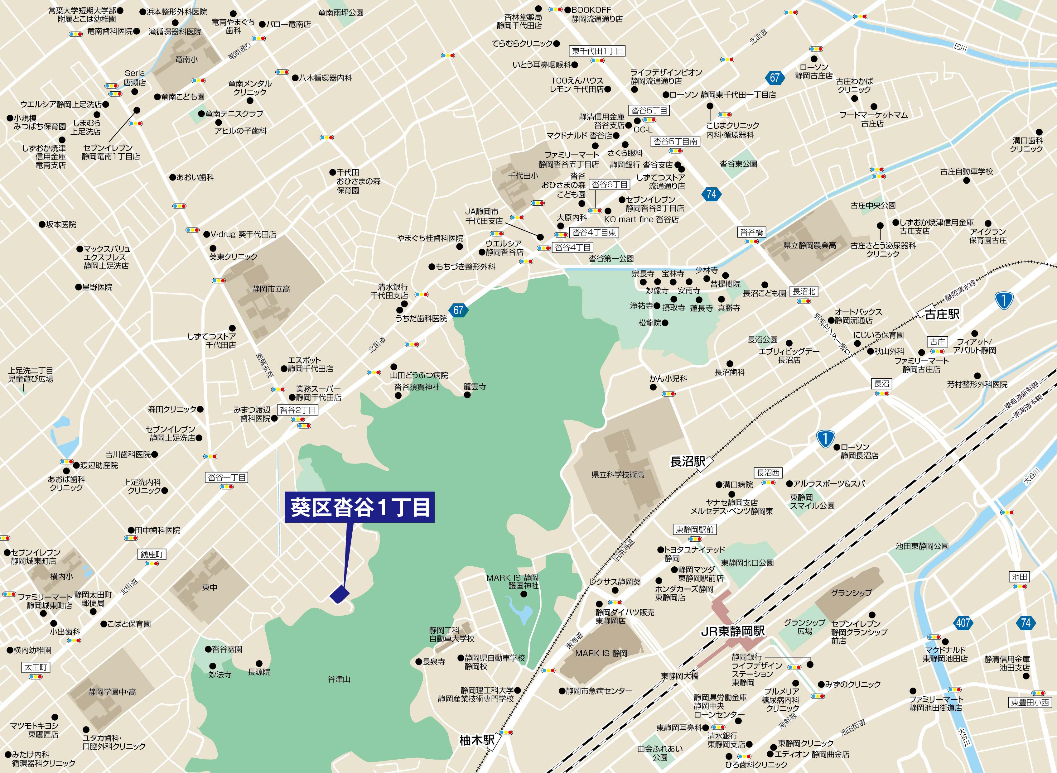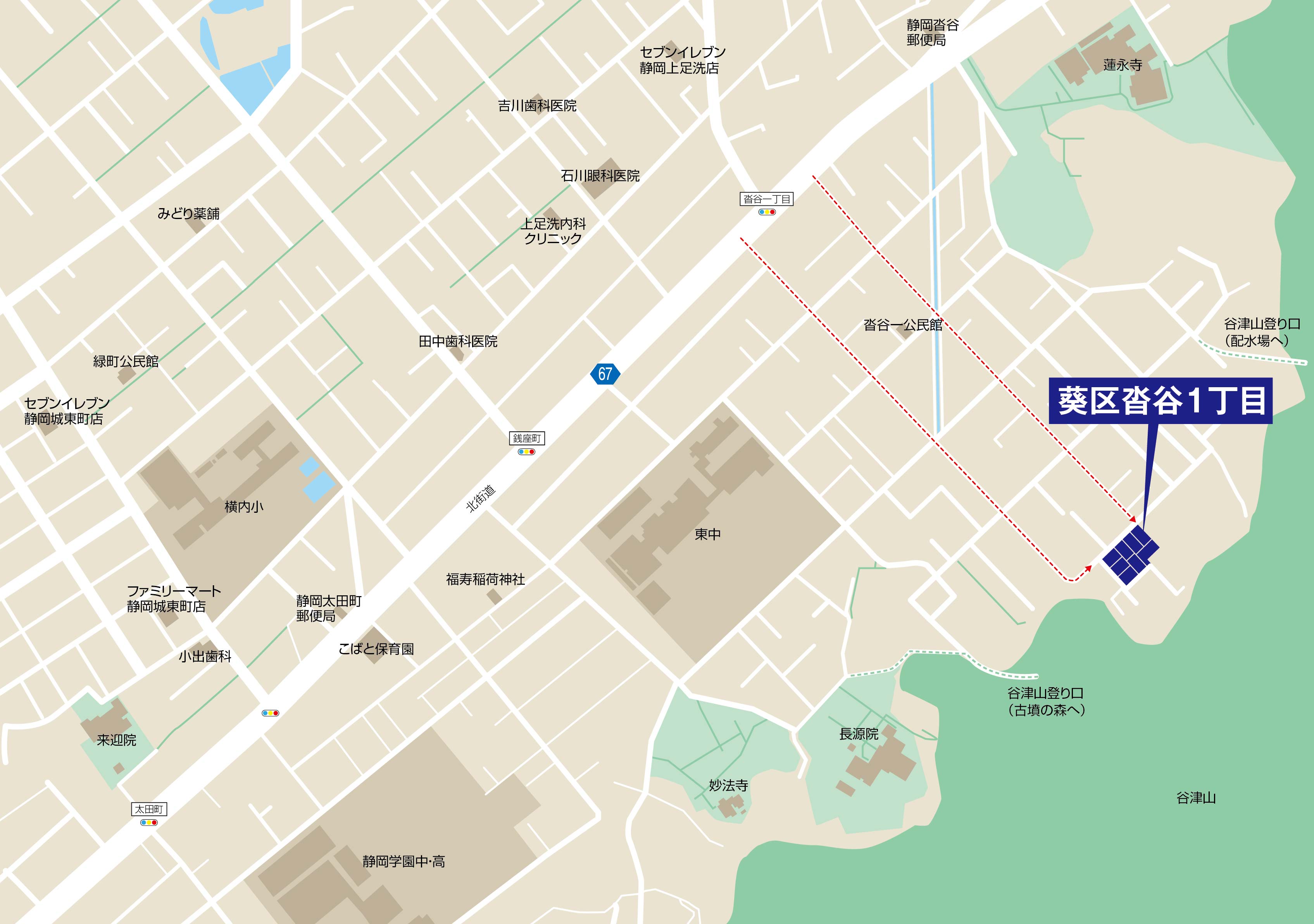 静岡市葵区に新たに造成された全8区画の分譲地が沓谷 1 丁目です。唐瀬街道と北街道が交差する谷津山の山裾に位置し自然に親しみながら、利便性の高い都市生活を送れる、バランスの取れた住みやすいロケーションがあります。JR 静岡駅から約2.8㎞という距離にあり交通アクセスも良く、周辺は閑静な住宅地が広がる治安が良いエリアです。幼稚園・保育園・小学校中学校などは公立私立合わせて教育施設が充実しており、子育てしやすい環境にあります。