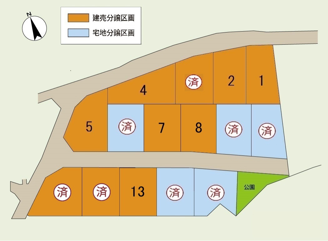 | 建物完成時期 | 【 1号地 ・ 2号地 ・ 4号地 ・ 5号地 】2025年6月、 【 7号地 ・ 8号地 ・ 13号地 】2025年8月 |