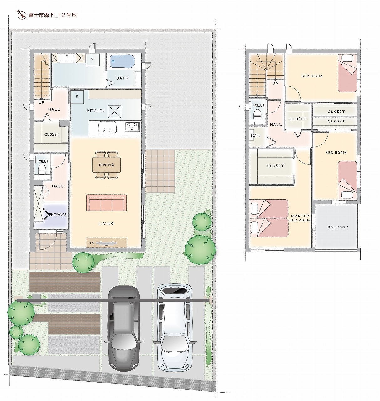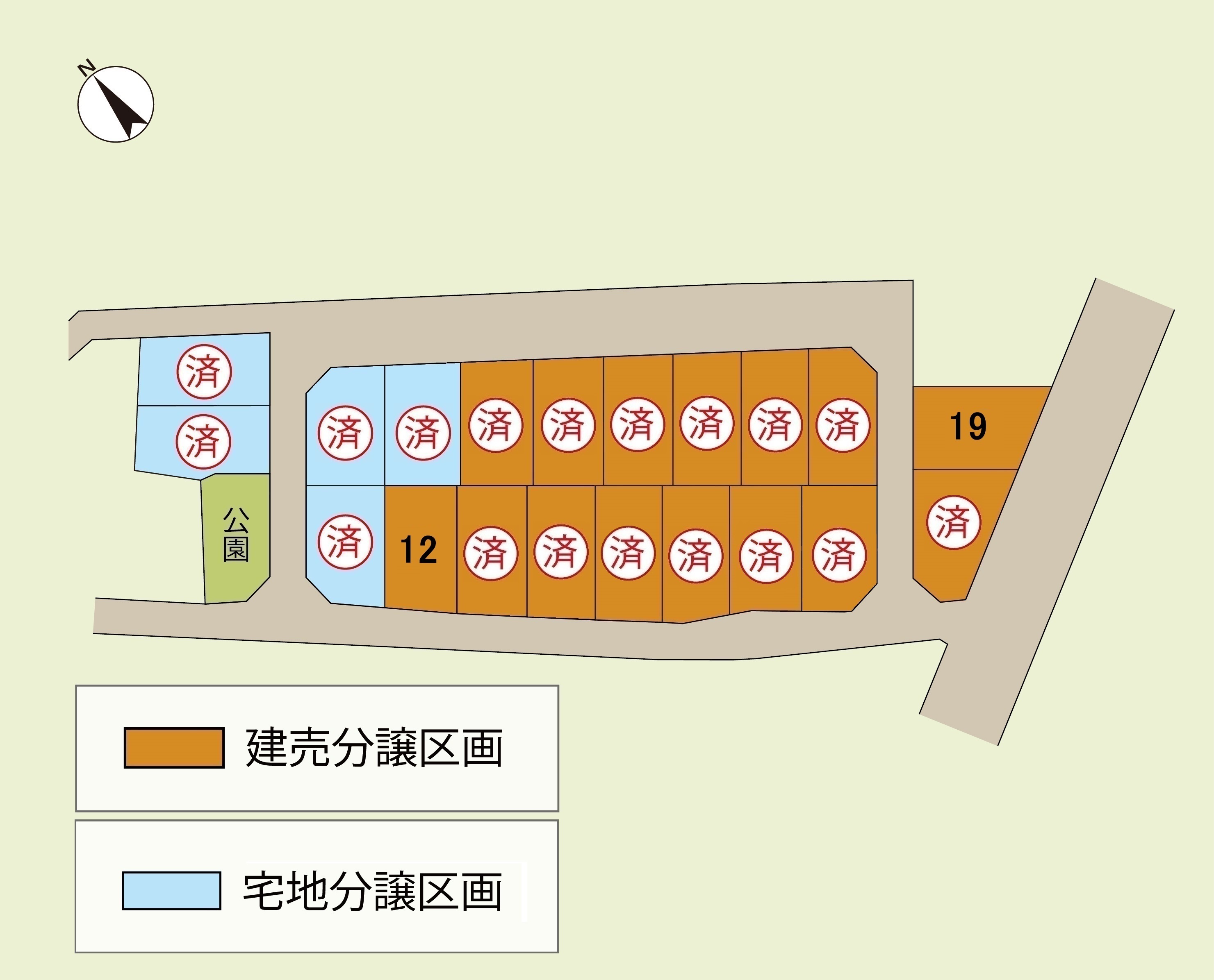 | 建物構造 | 【 12号地 】 軽量鉄骨造2階建、 【 19号地 】 木造(2×6)2階建 |