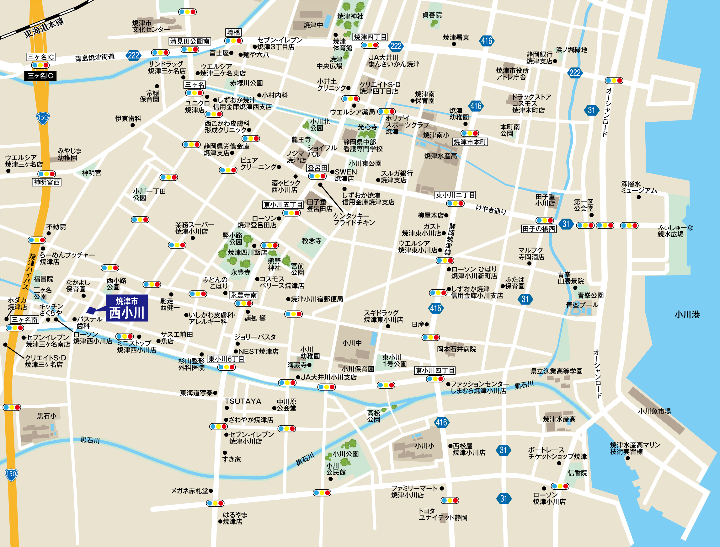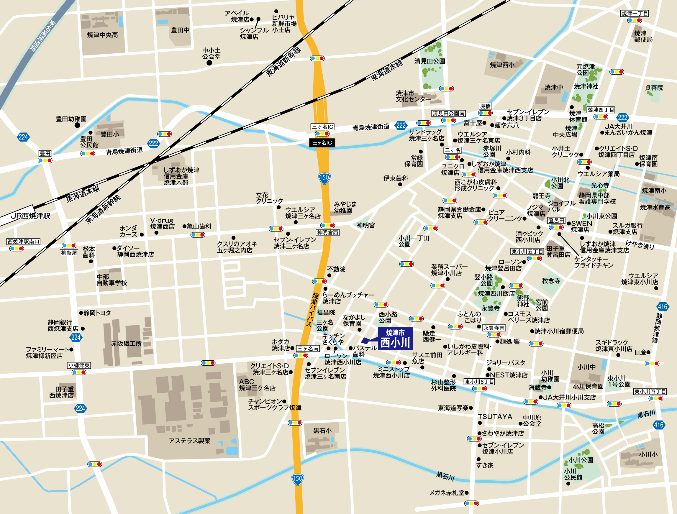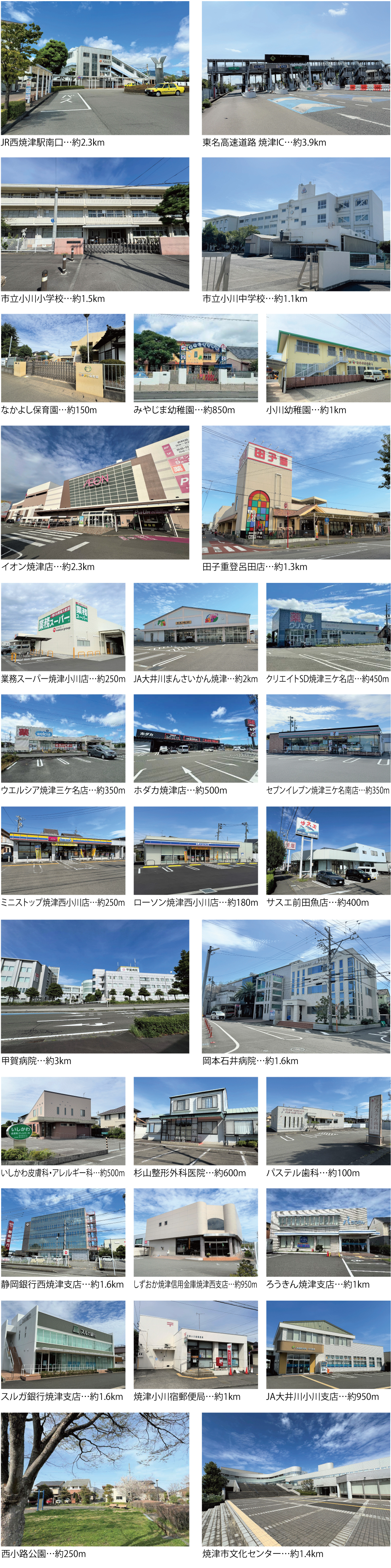焼津市西小川(こがわ)は国道150号線「三ヶ名南交差点」の東側の住宅地に誕生した分譲地です。周辺は区画整理事業による住環境整備が進められ、小川公園や竪小路公園などの市民公園もある快適な居住環境となっています。最寄り駅となるJR西焼津駅南口まで約2.2㎞、国道150号線へのアクセスも良好で通勤通学にも便利な立地にあります。