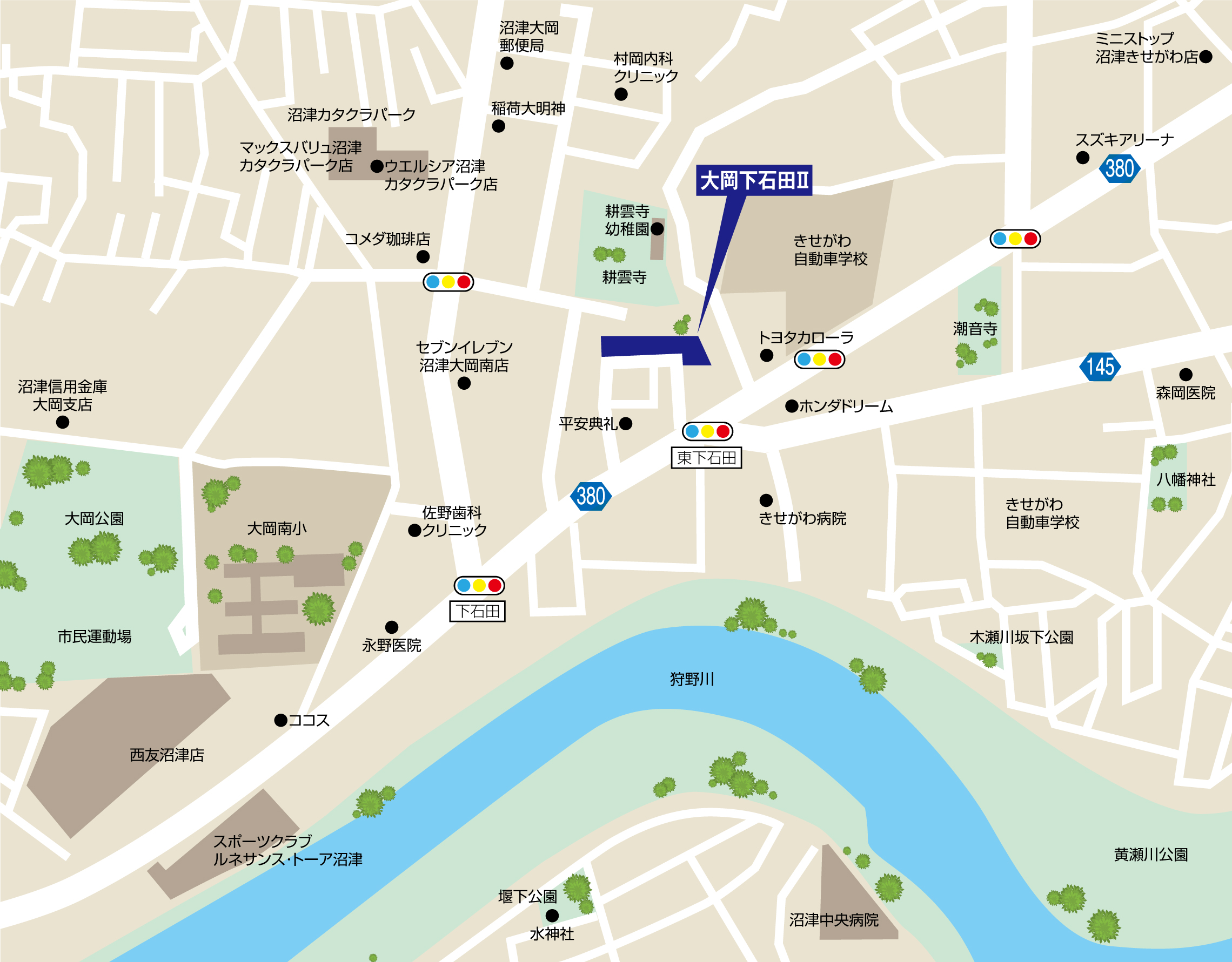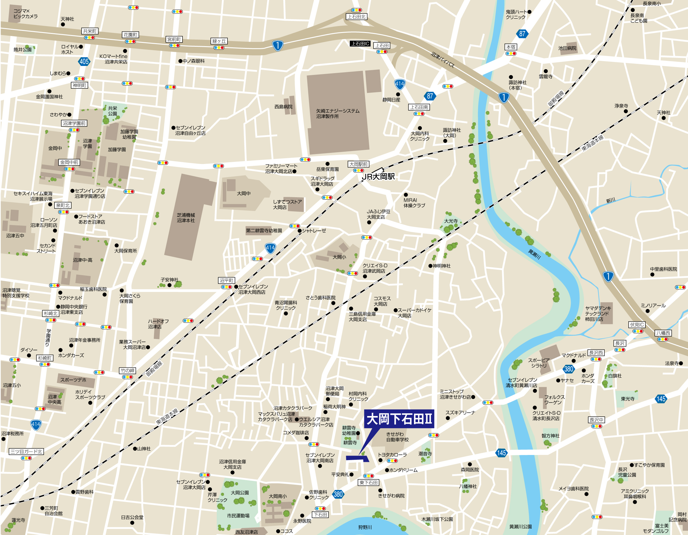 JR御殿場線「大岡」駅より約2.0㎞ JR東海道本線「沼津」駅より約2.2㎞ 東名高速道路「沼津」I.Cから約6.7㎞ 新東名高速道路「長泉沼津」I.Cから約9.0㎞