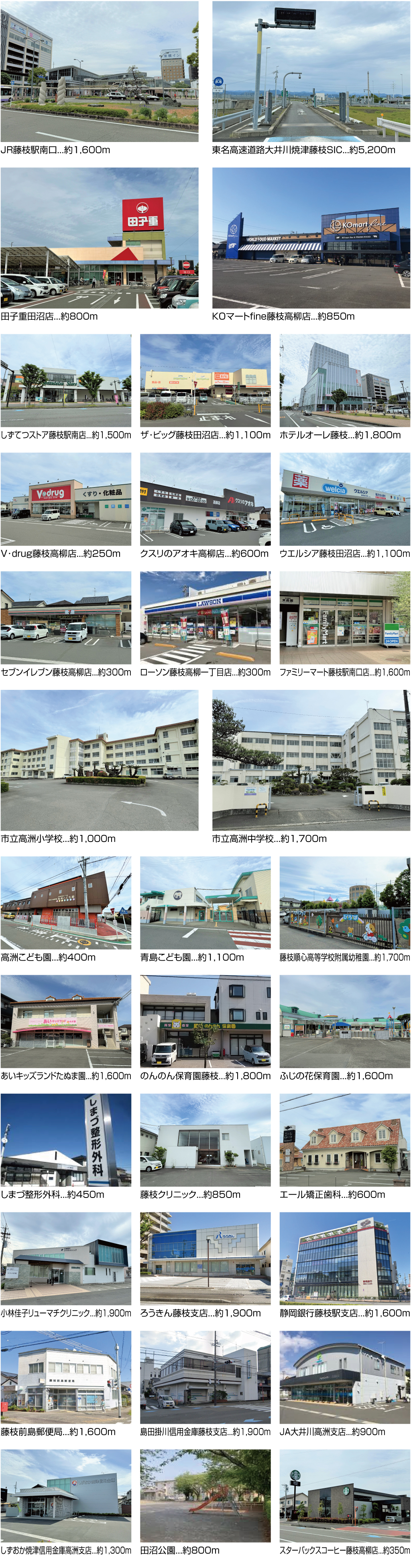 藤枝駅南口から東へ 1.6 ㎞の住宅街に造成された 2 区画の分譲地が「高柳 1 丁目」です。周辺はスターバックスコーヒーや KO マートのあるおしゃれな市街地エリアで、買い物スポットも多く都会的な暮らしを楽しむことができます。駅前の「ホテルオーレ」には、「MIPLAZA(エムアイプラザ)三越伊勢丹」が併設されています。また、隣接している「オーレ藤枝」にはショップやカフェ、フィットネスクラブなど魅力的な施設も多数あります。そのほか、映画館や図書館も入る大型の商業施設「BiVi 藤枝」も気軽にお出かけが楽しめます。また、高柳は、周辺の主要地域である静岡市や掛川市へのアクセスが良好です。そのため、静岡市内などへ通勤通学に通う人たちにとって便利で住みやすい 地域となっています。所要時間は、JR 藤枝駅から静岡駅までは東海道本線(静岡行き)で約 20 分、掛川駅までは東海道本線(浜松行き)で約 26分です。