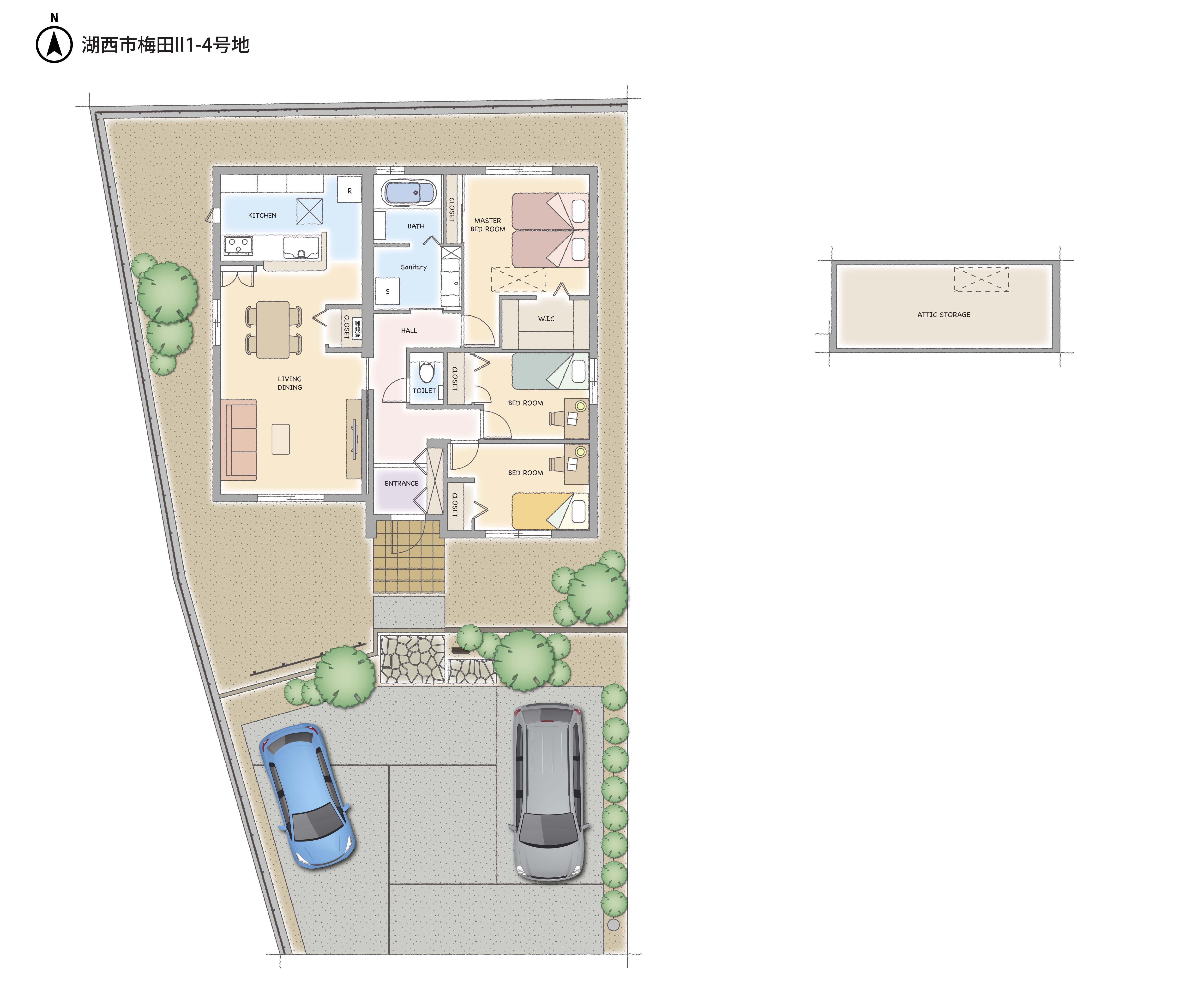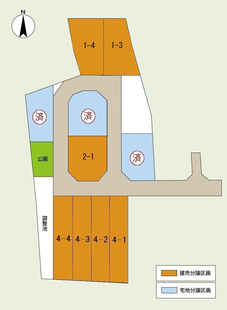 | 建物構造 | 【 4-1号地・ 4-2号地・ 4-3号地・ 4-4号地 】 軽量鉄骨造2階建、 【 1-4号地・ 2-1号地 】 木造(2×6)平屋建、 【 1-3号地 】 木造(2×6)2階建 |