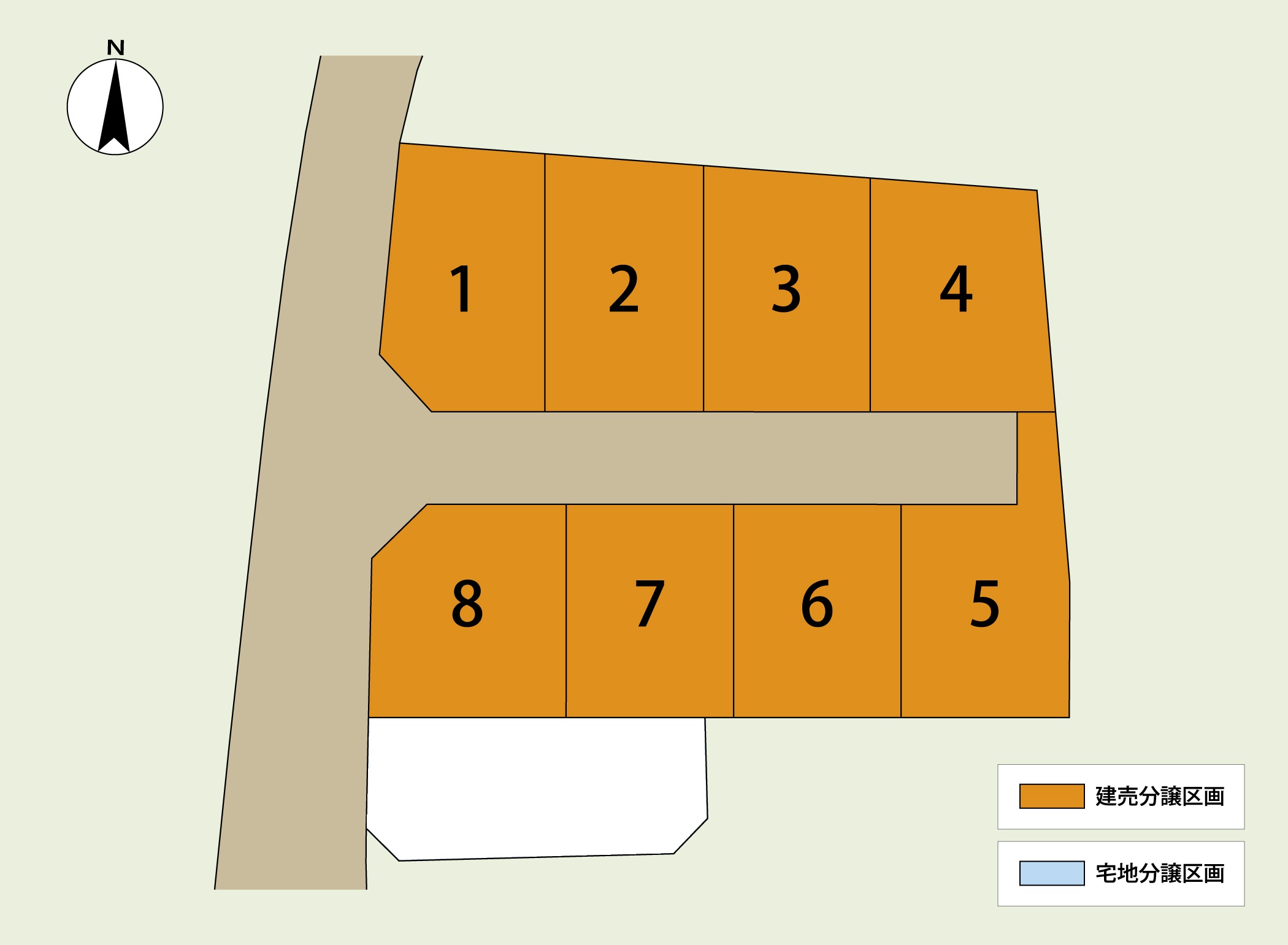 | 建物完成時期 | 【 1号地 ・ 2号地 ・ 3号地 ・ 4号地 ・ 5号地 ・ 6号地 ・ 7号地 ・ 8号地 】2025年10月 |