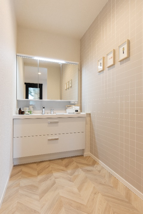 奥様こだわりのタイルで設えた洗面インテリアは、SNSで見かけてひとめぼれしたものを再現。家全体の雰囲気ともマッチした洗面空間となりました。