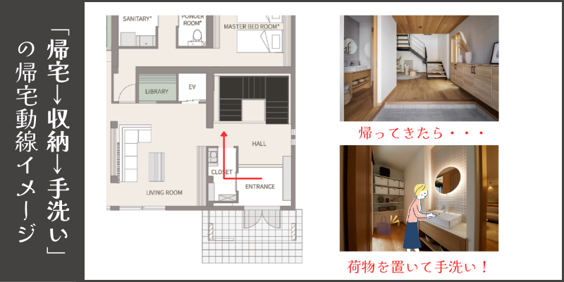また、手をせっかく洗ったのに、再びバックを持ち直し収納するとなってしまうと、手洗いの意味もなくなってしまいますね。 この場合、「帰宅→収納→手洗い」ができるように動線を整える必要があります。家族の動線に合わせた間取りにすることが大切です。