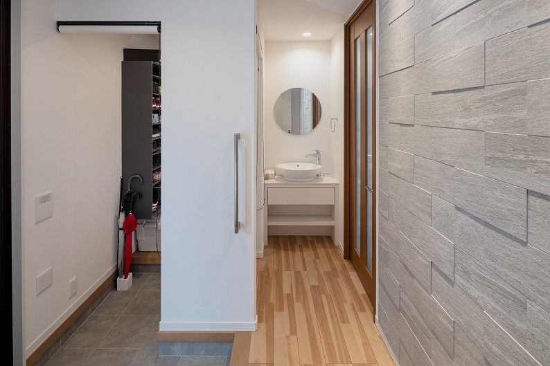 帰宅時の動線内に洗面があるので、必然的に洗面が視界に入ります。