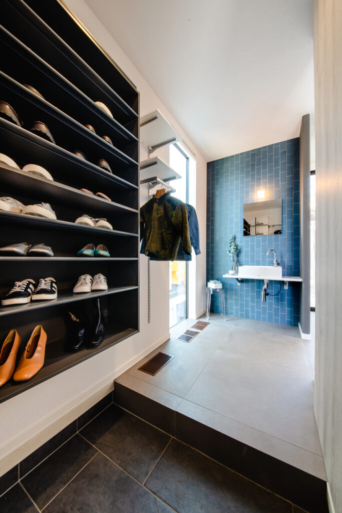 土間続きのシューズインクローゼットとリビングへの扉の間に洗面を設けました。来客時、玄関から直接洗面やミラーが視界に入らないように設置しています。