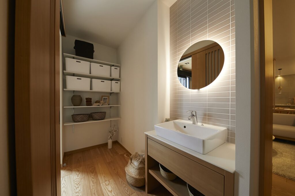 帰宅時の動線内に洗面があるので、必然的に洗面が視界に入ります。
