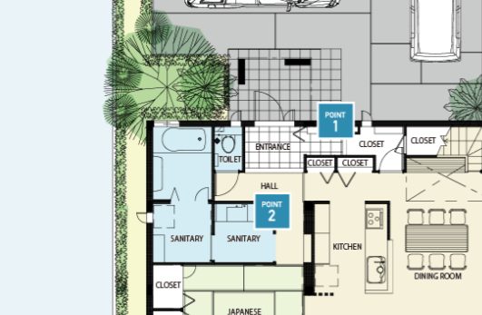ただし、図のように、トイレや脱衣室に近いところに配置することによって、トイレに設置する手洗いが不要になったり、玄関と洗面脱衣室にそれぞれ洗面台を設置するのではなく、玄関手洗いと洗面脱衣室の手洗いを1つにまとめてしまうことができればコストも削減可能です。