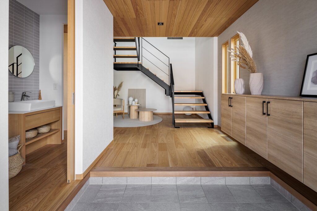 洗面脱衣室は、プライベートな空間であり、雑多になりがちです。玄関手洗いでは、そういった生活空間と来客動線を隔てることができ、家族にも来客にもメリットとなります。