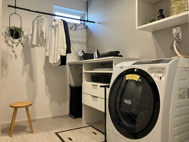 衣類関係の家事は一カ所で完結するように設計。「夜に洗濯した衣類を、洗濯機の隣に付けたハンガーパイプにかけておくと、快適エアリーのおかげで朝には乾いているんです。あとは畳んだ衣類を目の前にある棚に収納するだけなので家事が楽ですね」と奥さまはコンパクトに家事を済ませられる設計が気に入っているそうです。