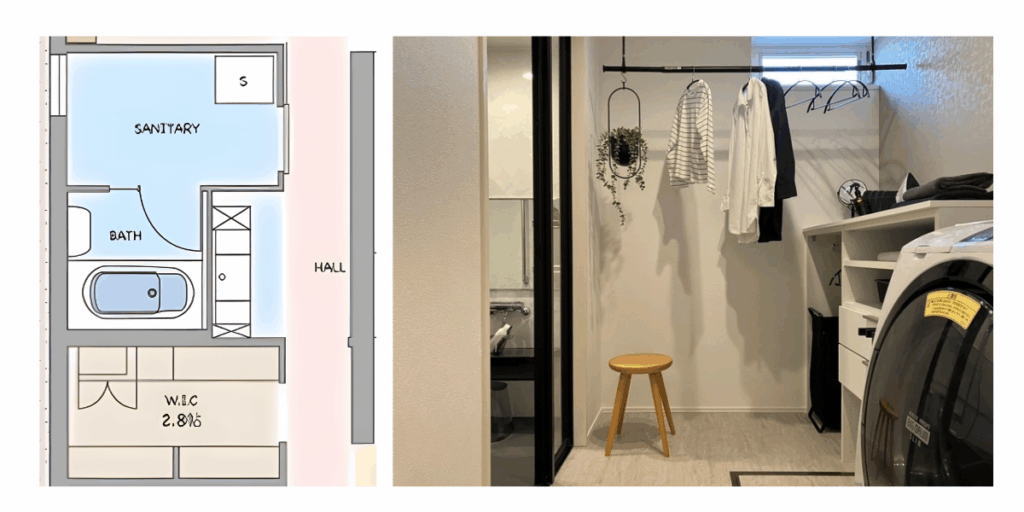 お風呂、洗面脱衣室、洗濯スペース、WICが併設されたパターンです。