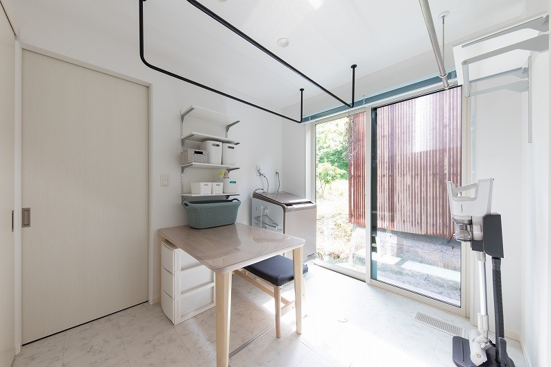 このケースでは、物干しスペースと収納棚兼、アイロンなどの作業台が設置してあります。洗面台は別スペースに出してあるため、来客時に洗濯物スペースが見られる心配がなくなります。