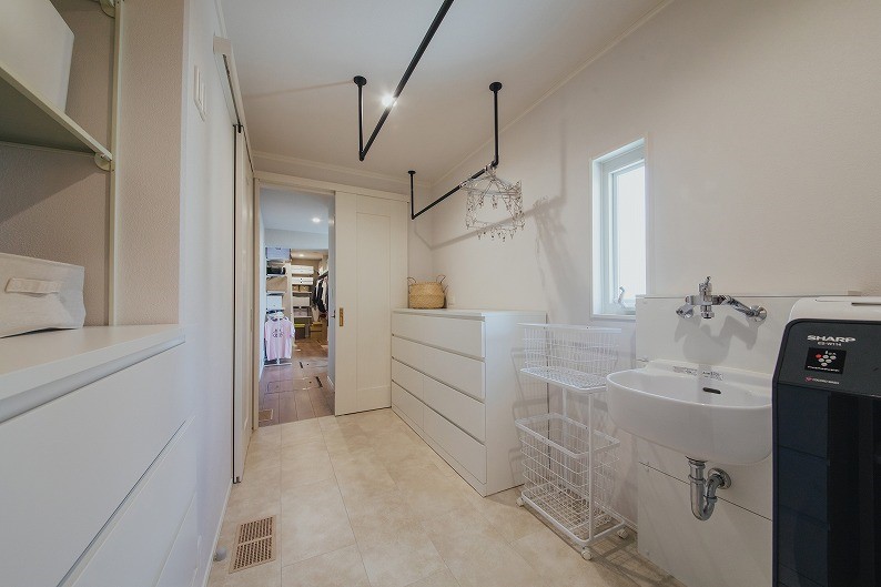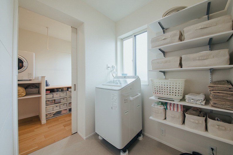 洗面脱衣室とは別にランドリースペースを設置されたHさま。キッチンからの回遊動線も便利で、「洗面」「脱衣」「ランドリールーム」をすべて分離して設置されています。