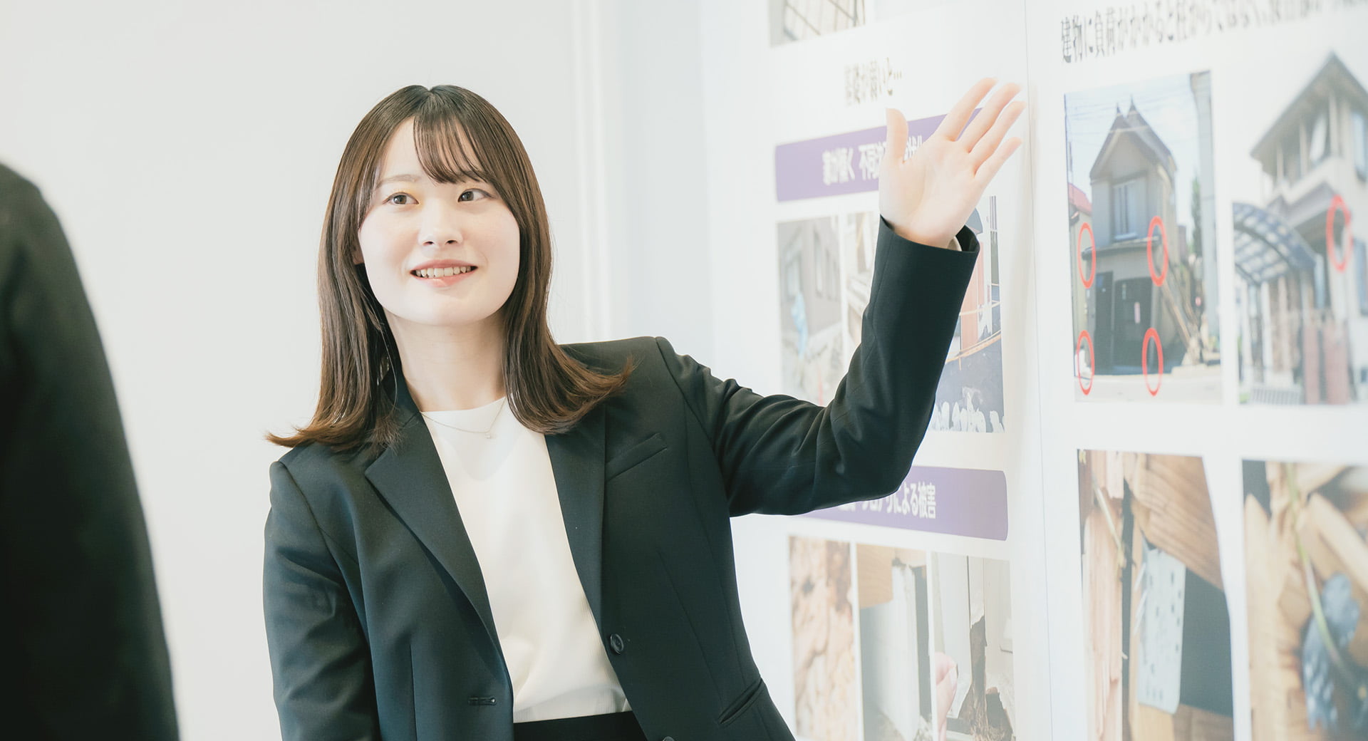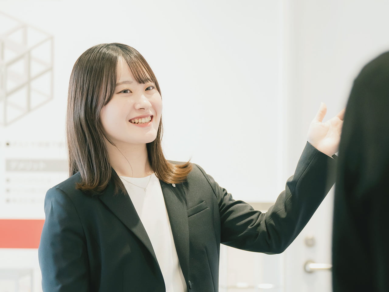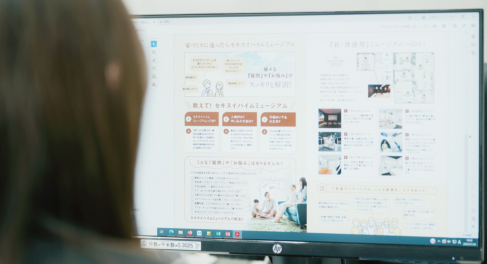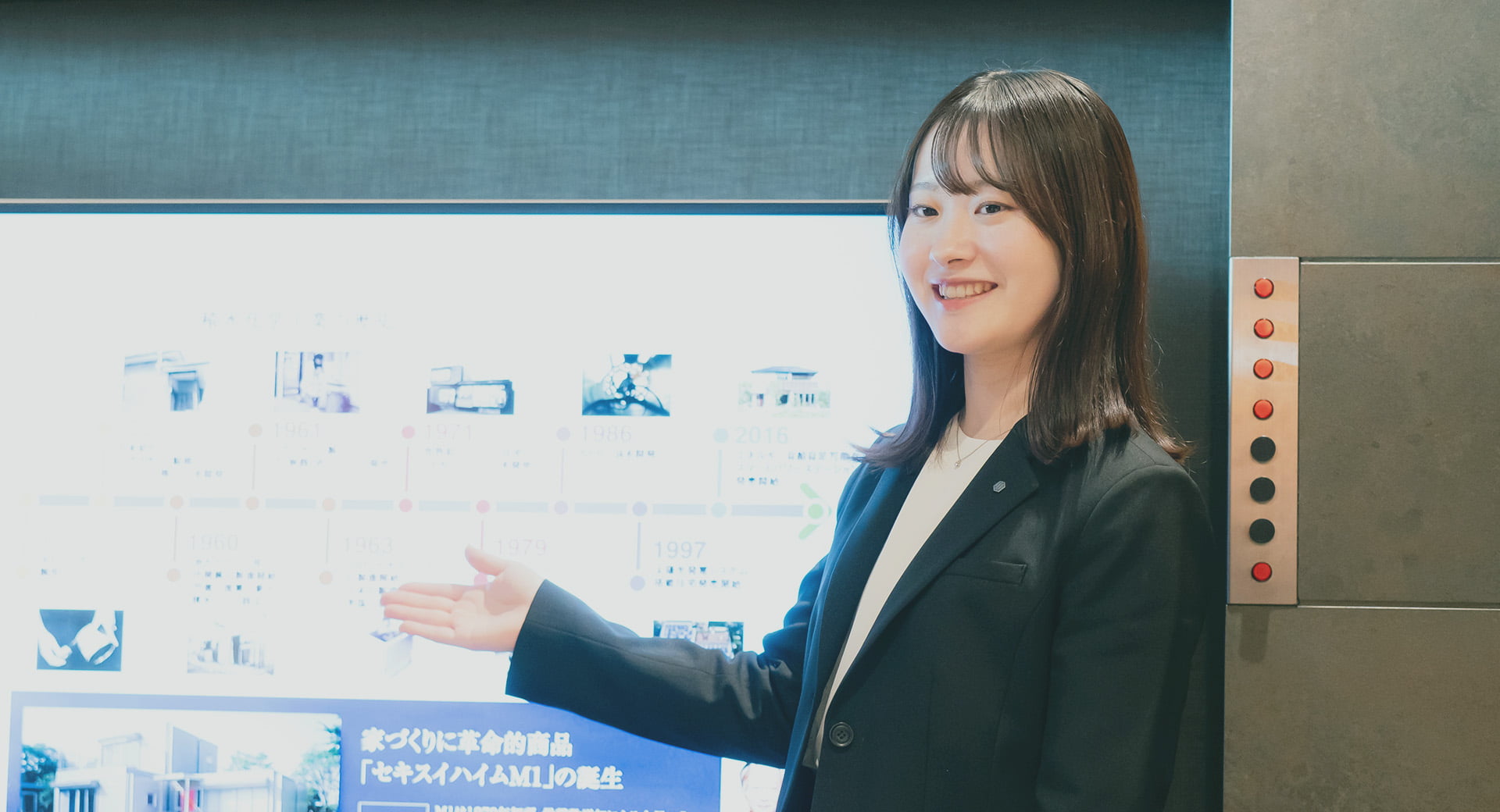 家づくりの基礎知識を学べる体感型ショールーム「セキスイハイムミュージアム沼津」のコンシェルジュを担当しています。ミュージアムのオープン準備、誘致用チラシの作成、来場予約・実績管理などが主な業務です。館内案内は館長や営業担当が行いますが、来場したお客様と最初に接するのは、私たちコンシェルジュです。どういった印象を与えるかで、その後の館内案内の雰囲気も、ひいてはご契約にいただけるかどうかにも、影響を与えます。笑顔で接するのはもちろんのこと、丁寧な対応を心がけています。