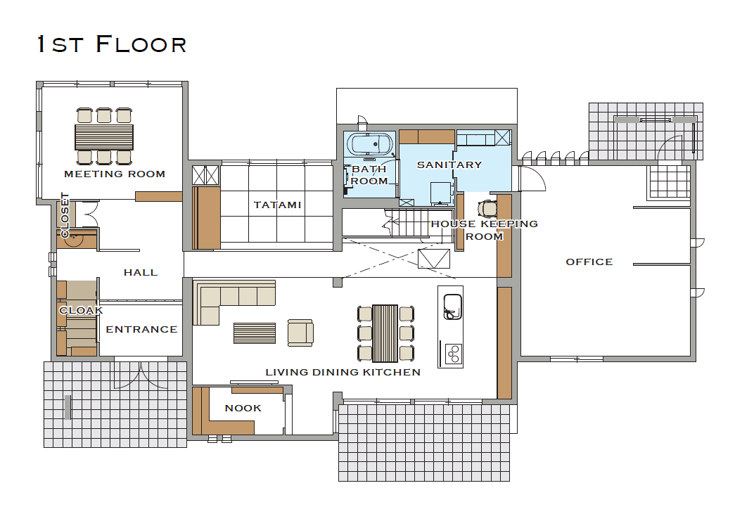 リビングと和室を隣接させて南北に開口を取り、水平方向に広さを感じる空間に。ダイニングと階段を隣接させて垂直方向に開き、開放感を感じるLDKになっています。